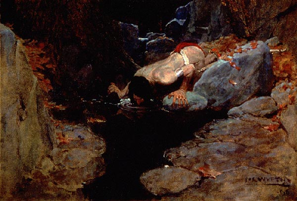Look at the translucent light in the water of “The Wreck of the Covenant” in Kidnapped...the rats scurrying up the staircase in “The Black Arrow”...the solemnity of the handshake in that same book...Magua kidnapping Alice in “The last of the Mohicans” where between a blue sky and a sunlit glade a half dozen slaughtered women lie. You can’t take your eyes off that bloody tomahawk stuck in a tree.”The Battle of Gen Falls”...Uncas Slays a Deer”...”Captain Bill Bones”...”Old Pew”...”The Hostage”... If you haven’t seen these books and pictures, track them down. What you’ve missed!